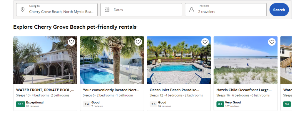 - Vrbo: This website offers 251 pet-friendly vacation rentals in Cherry Grove Beach, North Myrtle Beach. Prices start at $75 per night, and you can book directly from the owner.